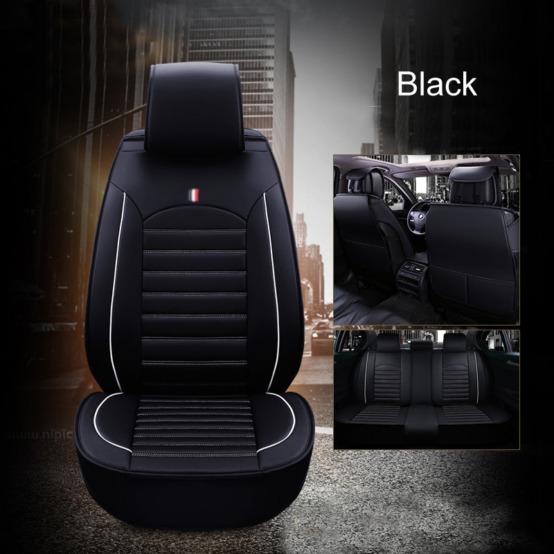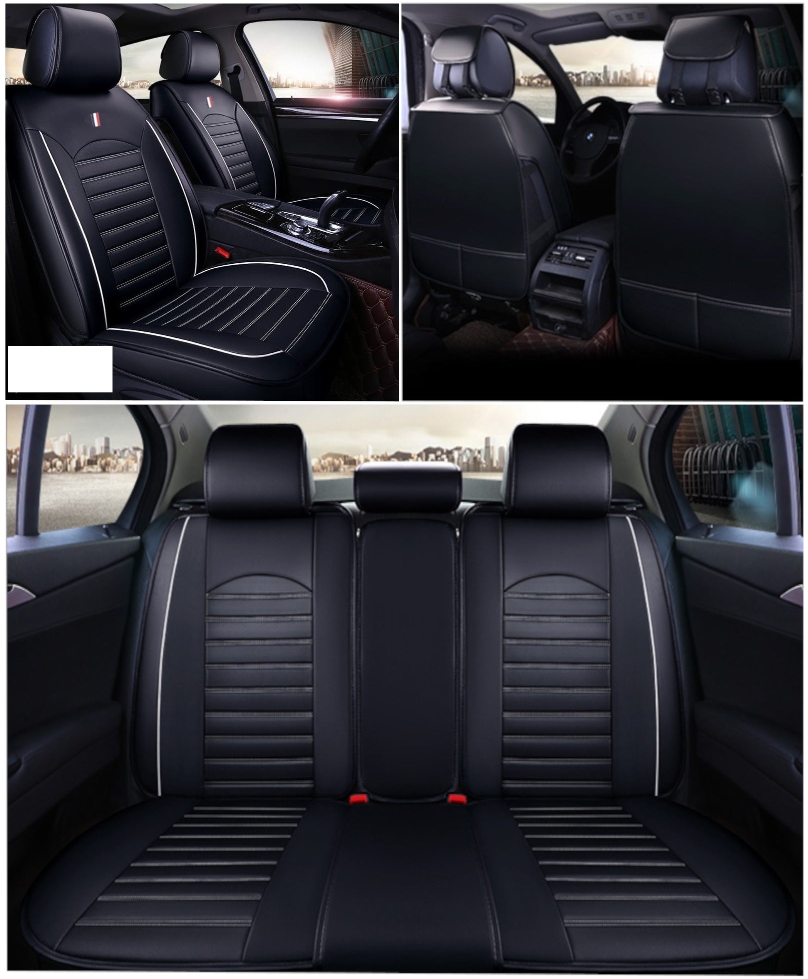 Висококачествена пълен комплект черна тапицерия от изкуствена кожа с бродерия в бели цветове. Луксозна тапицерия Изработени от висококачествена PU изкусвена кожа и мека пяна, осигуряват удобно чувство за сядане. Ръчно шити. Универсален дизайн, подходящ за всички автомобили. Дизайн, съвместим с airbag - въздушни възглавници. Устойчивост на износване, добър водоустойчив ефект и силна огнезащитна способност. Лесна инсталация. Цялостен дизайн, покрива предната и задната част на седалката. Пакет, включващ: 9 части, предни и задни.