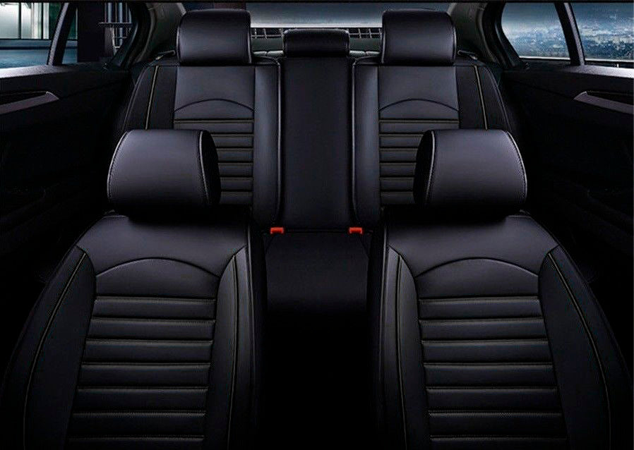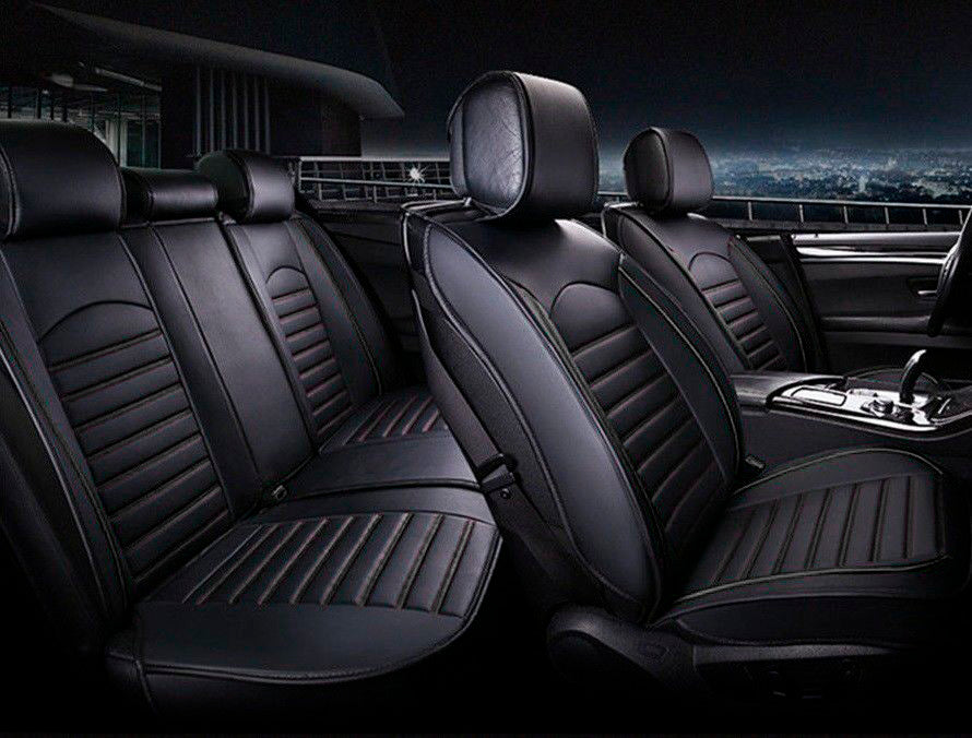 Пълен Комплект Луксозни Калъфи за Седалки Универсална Кожена Тапицерия Черна Еко Кожа с Черен Шев