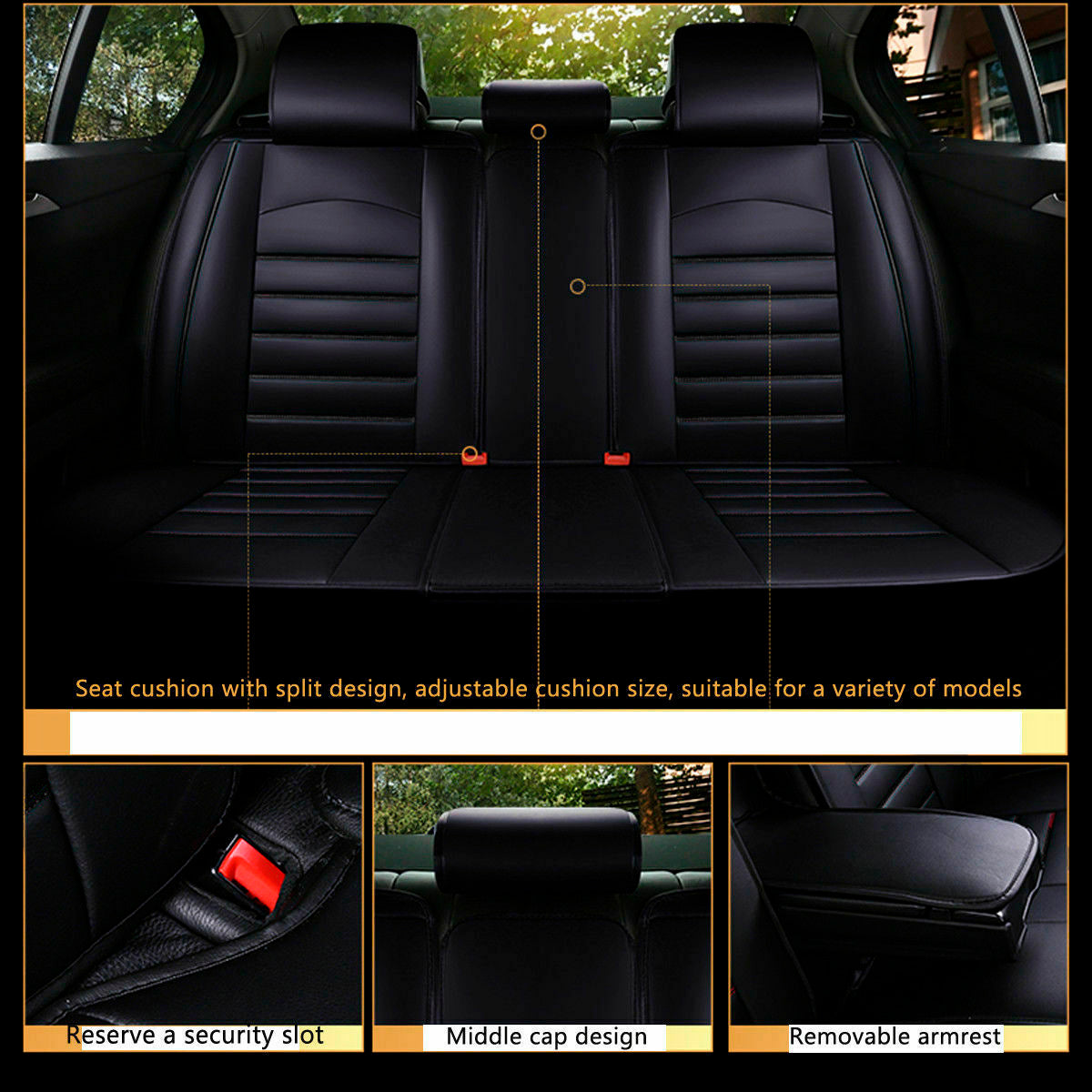 Висококачествена пълен комплект черна тапицерия от изкуствена кожа, кожена бродерия и кантове с черни цветове. Луксозна тапицерия Изработени от висококачествена PU изкусвена кожа и мека пяна, осигуряват удобно чувство за сядане. Ръчно шити. Универсален дизайн, подходящ за всички автомобили. Дизайн, съвместим с airbag - въздушни възглавници. Устойчивост на износване, добър водоустойчив ефект и силна огнезащитна способност. Лесна инсталация. Цялостен дизайн, покрива предната и задната част на седалката. Пакет, включващ: 9 части, предни и задни.