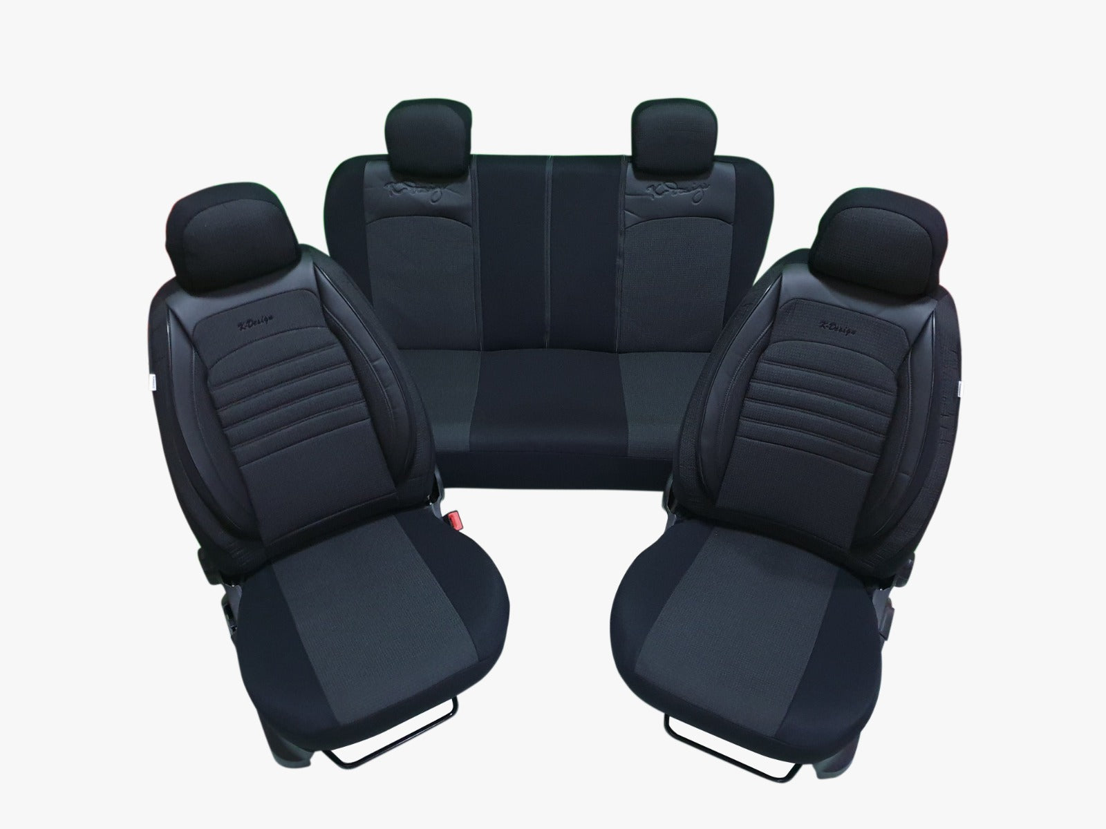 Пълен комплект - LUXE - тапицерия/калъфи от еко кожа и текстил - / кожа-черно - текстил-черно / - Пълен комплект: Шофьорска седалка, пасажерска седалка и задна седалка. Комплектът включва: 1 x калъф за шофьорската седалка 1 x калъф за пасажерска седалка 1 х калъф за задна седалка 4 x калъфи за облегалки за глава * подходящи за автомобили с ляв и десен волан * Бързо и лесно монтиране - просто поставете върху оригиналните седалки и изпънете (с ластици отдолу, така, че да се изпъват сегнато по седалките) * Подходящи са за автомобили с въздушни възглавници и могат да се ползват с подлакътник. * Лесно почистване - просто забършете. * Ушити от качествен текстил и еко кожа. - Тези калъфи са предназначени да предпазят вашата оригинална тапицерия от замърсяване и износване. - Дори редовно почистване не може да спре ежедневното износване. - Защитете оригиналната тапицерия на автомобила си. За въпроси може да ни потърсите на посочения телефон в работно време.