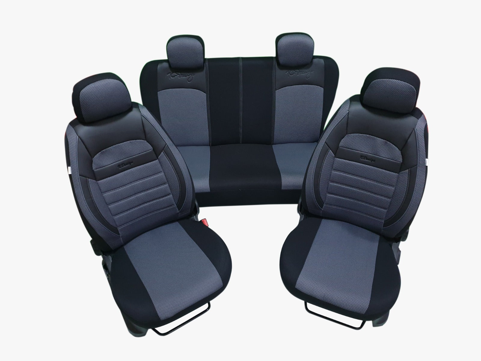 Пълен комплект - DESIGN - тапицерия/калъфи от еко кожа и текстил - / черно - тъмно сиво / - Пълен комплект: Шофьорска седалка, пасажерска седалка и задна седалка. Комплектът включва: 1 x калъф за шофьорската седалка 1 x калъф за пасажерска седалка 1 х калъф за задна седалка 4 x калъфи за облегалки за глава * подходящи за автомобили с ляв и десен волан * Бързо и лесно монтиране - просто поставете върху оригиналните седалки и изпънете (с ластици отдолу, така, че да се изпъват сегнато по седалките) * Подходящи са за автомобили с въздушни възглавници и могат да се ползват с подлакътник. * Лесно почистване - просто забършете. * Ушити от качествен текстил и еко кожа. - Тези калъфи са предназначени да предпазят вашата оригинална тапицерия от замърсяване и износване. - Дори редовно почистване не може да спре ежедневното износване. - Защитете оригиналната тапицерия на автомобила си. За въпроси може да ни потърсите на посочения телефон в работно време.