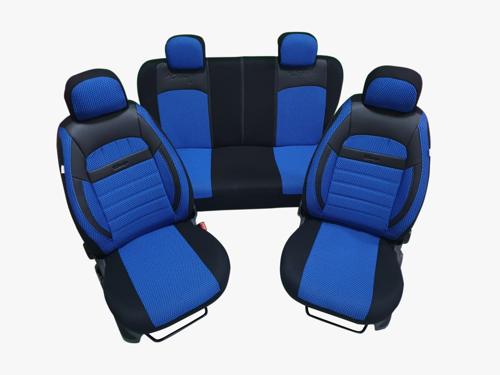 Пълен комплект - LUXE - тапицерия/калъфи от еко кожа и текстил - / черно - синьо / - Пълен комплект: Шофьорска седалка, пасажерска седалка и задна седалка. Комплектът включва: 1 x калъф за шофьорската седалка 1 x калъф за пасажерска седалка 1 х калъф за задна седалка 4 x калъфи за облегалки за глава * подходящи за автомобили с ляв и десен волан * Бързо и лесно монтиране - просто поставете върху оригиналните седалки и изпънете (с ластици отдолу, така, че да се изпъват сегнато по седалките) * Подходящи са за автомобили с въздушни възглавници и могат да се ползват с подлакътник. * Лесно почистване - просто забършете. * Ушити от качествен текстил и еко кожа. - Тези калъфи са предназначени да предпазят вашата оригинална тапицерия от замърсяване и износване. - Дори редовно почистване не може да спре ежедневното износване. - Защитете оригиналната тапицерия на автомобила си. За въпроси може да ни потърсите на посочения телефон в работно време.