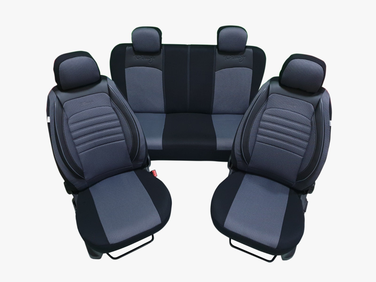 Пълен комплект - LUXE - тапицерия/калъфи от еко кожа и текстил - / черно - сиво / - Пълен комплект: Шофьорска седалка, пасажерска седалка и задна седалка. Комплектът включва: 1 x калъф за шофьорската седалка 1 x калъф за пасажерска седалка 1 х калъф за задна седалка 4 x калъфи за облегалки за глава * подходящи за автомобили с ляв и десен волан * Бързо и лесно монтиране - просто поставете върху оригиналните седалки и изпънете (с ластици отдолу, така, че да се изпъват сегнато по седалките) * Подходящи са за автомобили с въздушни възглавници и могат да се ползват с подлакътник. * Лесно почистване - просто забършете. * Ушити от качествен текстил и еко кожа. - Тези калъфи са предназначени да предпазят вашата оригинална тапицерия от замърсяване и износване. - Дори редовно почистване не може да спре ежедневното износване. - Защитете оригиналната тапицерия на автомобила си. За въпроси може да ни потърсите на посочения телефон в работно време.