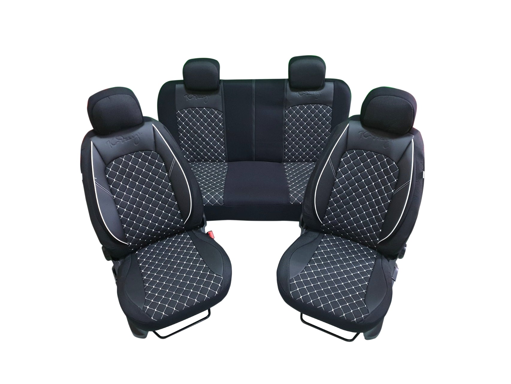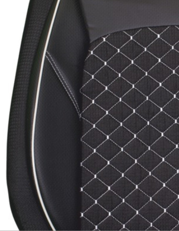 Пълен комплект PREMIUM тапицерия/калъфи от еко кожа и текстил / черно с бял шев / Съвместими с 99% от автомобилите със стандартни седалки. Изработени от качествени устойчиви на износване материали. Запазват оригиналната тапицерия от зацапване и износване. Съвместими със седалки с вградени въздушни възглавници. Закрепя се под седалката с метални ластици и кукички, стои изпънато. Комплектът съдържа калъфи за: Предни седалки Задни седалки Облегалки за глава