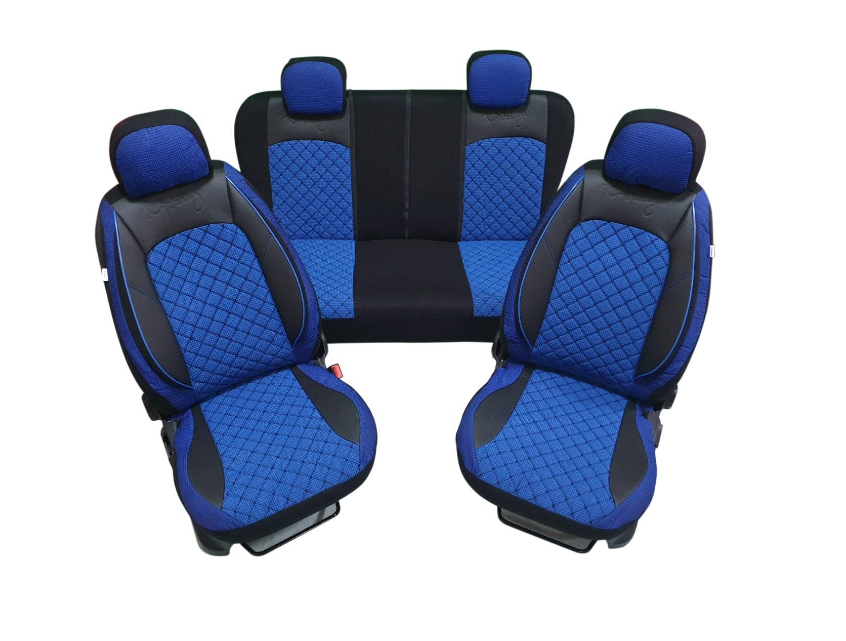 Пълен комплект PREMIUM тапицерия/калъфи от еко кожа и текстил / синьо с черно / Съвместими с 99% от автомобилите със стандартни седалки. Изработени от качествени устойчиви на износване материали. Запазват оригиналната тапицерия от зацапване и износване. Съвместими със седалки с вградени въздушни възглавници. Закрепя се под седалката с метални ластици и кукички, стои изпънато. Комплектът съдържа калъфи за: Предни седалки Задни седалки Облегалки за глава