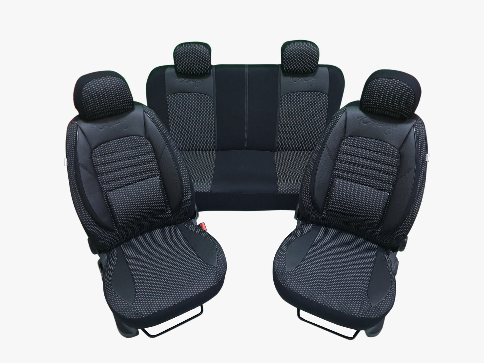Пълен комплект тапицерия/калъфи от еко кожа и текстил BALLANCE - / черно със сива шарка / - Пълен комплект: Шофьорска седалка, пасажерска седалка и задна седалка. Комплектът включва: 1 x калъф за шофьорската седалка 1 x калъф за пасажерска седалка 1 х калъф за задна седалка 4 x калъфи за облегалки за глава - тези калъфи имат възглавничка в областта на кръста за лумбална опора * подходящи за автомобили с ляв и десен волан * Бързо и лесно монтиране - просто поставете върху оригиналните седалки и изпънете (с ластици отдолу, така, че да се изпъват сегнато по седалките) * Подходящи са за автомобили с въздушни възглавници и могат да се ползват с подлакътник. * Лесно почистване - просто забършете. * Ушити от качествен текстил и еко кожа. - Тези калъфи са предназначени да предпазят вашата оригинална тапицерия от замърсяване и износване. - Дори редовно почистване не може да спре ежедневното износване. - Защитете оригиналната тапицерия на автомобила си. За въпроси може да ни потърсите на посочения телефон в работно време.