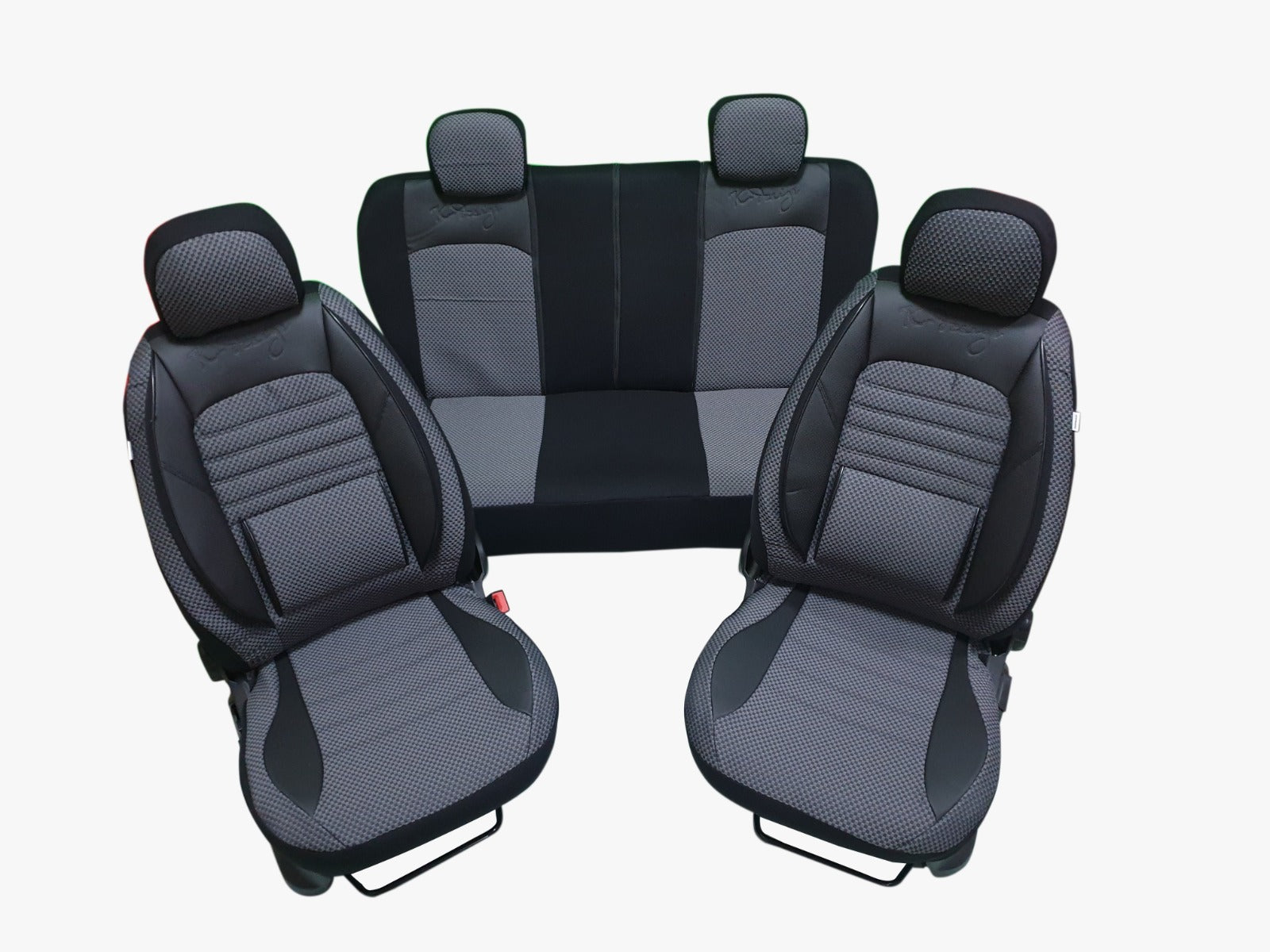 Пълен комплект тапицерия/калъфи от еко кожа и текстил BALLANCE - / черно със сиво / - Пълен комплект: Шофьорска седалка, пасажерска седалка и задна седалка. Комплектът включва: 1 x калъф за шофьорската седалка 1 x калъф за пасажерска седалка 1 х калъф за задна седалка 4 x калъфи за облегалки за глава - тези калъфи имат възглавничка в областта на кръста за лумбална опора * подходящи за автомобили с ляв и десен волан * Бързо и лесно монтиране - просто поставете върху оригиналните седалки и изпънете (с ластици отдолу, така, че да се изпъват сегнато по седалките) * Подходящи са за автомобили с въздушни възглавници и могат да се ползват с подлакътник. * Лесно почистване - просто забършете. * Ушити от качествен текстил и еко кожа. - Тези калъфи са предназначени да предпазят вашата оригинална тапицерия от замърсяване и износване. - Дори редовно почистване не може да спре ежедневното износване. - Защитете оригиналната тапицерия на автомобила си. За въпроси може да ни потърсите на посочения телефон в работно време.