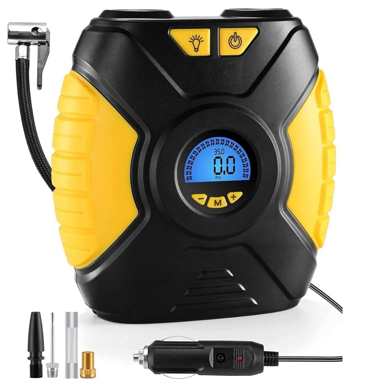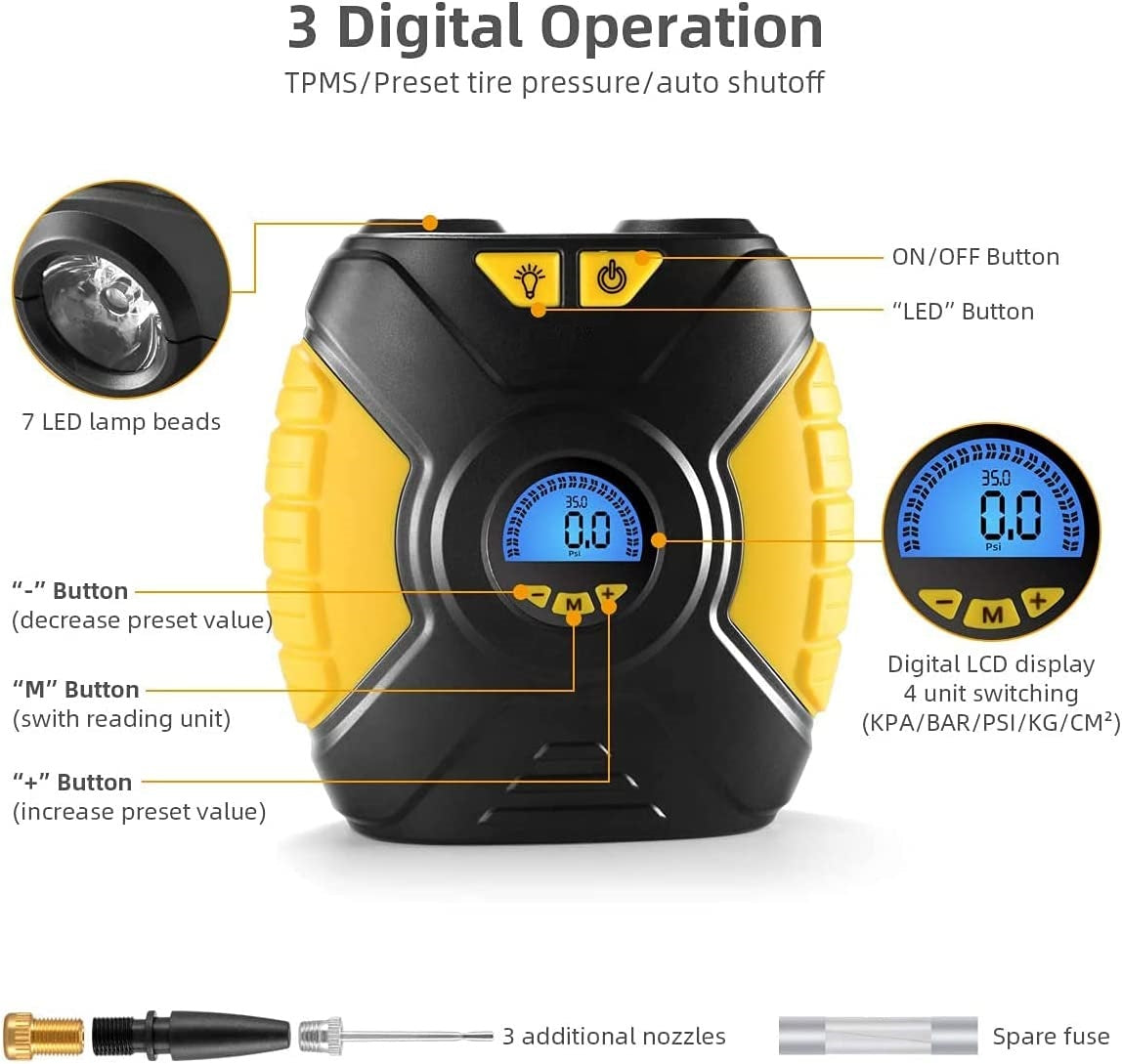 Преносим дигитален електронен компресор за въздух за автомобилни гуми 12V + фенер 120W 15A 120Psi ЛЕСЕН ЗА ИЗПОЛЗВАНЕ БЪРЗО НАПОМПАНЕ Просто включете компресора за гуми в 12V устойство на запалката на автомобила и прикрепете маркуча към гумата, която искате да напомпате. Има цифров дисплей, както и превключвател на режима за превключване между различни мерни единици (bar, Kpa, psi, Kg/cm 2). Той автоматично ще се изключи при достигане на предварително зададената от вас стойност на налягането. Отнема по-малко време и усилия от крачна помпа. Компресора за гуми е направена с оригиналния и уникален механизъм с турбокомпресор, който е по-мощен, по-малко шумен и по-стабилен. Напомпва автомобилна гума 195/65R15 от 0 до 35psi за 5 минути. Удобен е в колата при ниско налягане на гумите на пътя. Също така е идеален за къмпинг, за да надуете надуваем дюшек, плувки или играчки за децата. Всички кабели се сгъват добре, за да може да се съхраняват в багажника, като заема минимнално място. Наистина е удобен за ежедневна употреба. Предлага се с 3 допълнителни адаптера. Перфектен за гуми за велосипеди, мотоциклети, SUV, спортно оборудване като играчки за басейн,топки и други надуваеми. Снабден с LED СВЕТЛИНА може да се използва много удобно ПРЕЗ НОЩТА. Има режим SOS. Дължина на маркуча -500 20 мм Mаксимално налягане =90PSI Дължина на кабела към запалката 3000100 мм Tочноста на измервателния уред 351psi Работна температура от -20 до +60 C Употреба. 1. Преди работа се уверете, че е здраво закрепен към гумата и въздушният маркуч не е огънат. 3. Не е подходящ за гуми на големи камиони, други превозни средства с гуми с високо налягане и големи обеми като надуваеми канута. 4. Когато сте работили с него 10 минути, оставете го да почине за 10 минути, преди да продължите да го използвате.