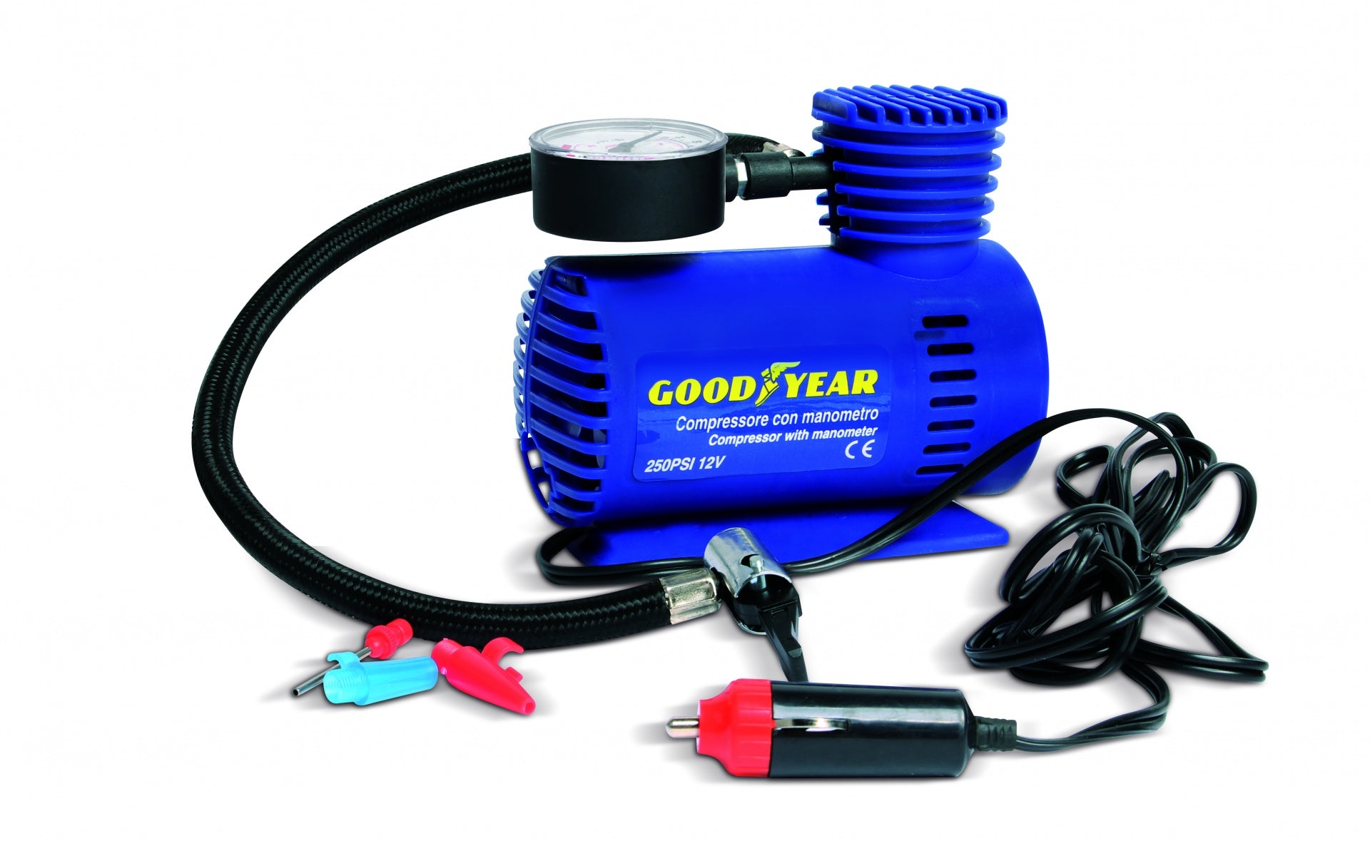 Преносим компресор за помпане на гуми с манометър + 3 накрайника STRONG 12 ATM 250PSI Goodyear Гудиър