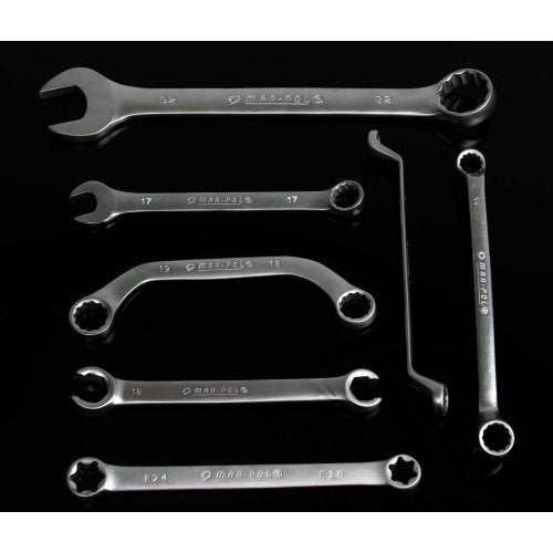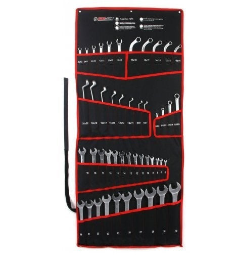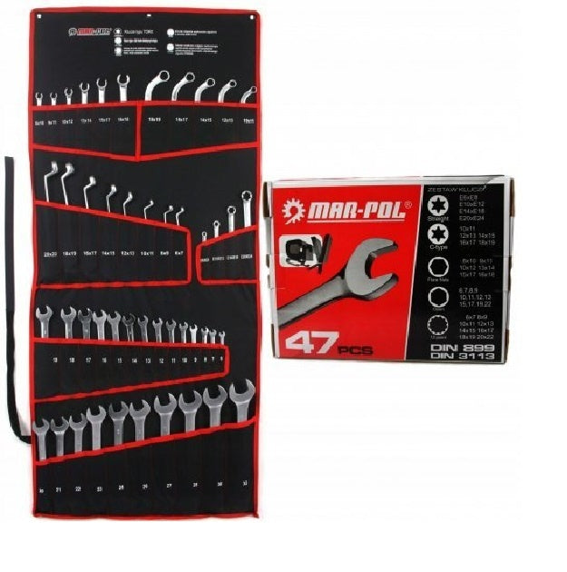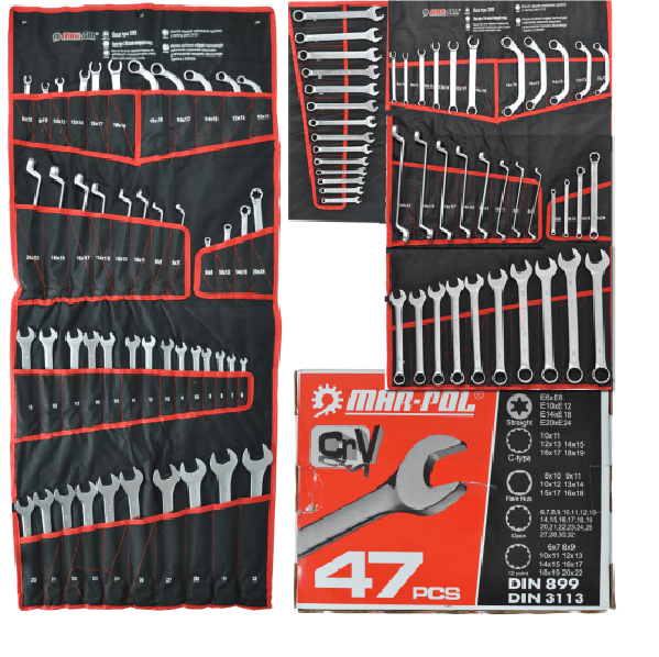 Комплект комбинирани гаечни ключове 47 части Изработени са от много издръжлива CRV хром-ванадиева стомана, професионални гаечни ключове, предназначени за работа в работилница, вулканизиране или домашен ремонт. Имат антикорозионно покритие Система за размери : метрична 12-точков гаечен ключ 15% наклон на работното ниво Специален профил на зъбите, който увеличава максималния момент на затягане с 25% (без да повреди гайката) Заоблени преходни форми между главата на ключа и дръжката Комплекта съдържа: Гаечени ключове : 8 х 10, 9 х 11, 10 х 12, 13 х 14, 15 х 17, 16 х 18 Комбинирани гаечени ключове : 6, 7, 8, 9, 10, 11, 12, 13, 14, 15, 16, 17, 18, 19, 20, 21, 22, 23, 24, 26, 27, 28, 30, 32 мм Гаечен ключ тип звезда : 6, 7, 8, 9, 10, 11, 12, 13, 14, 15, 16, 17, 18, 19, 20, 21, 22 мм Гаечен ключ тип полумесец : 10, 11, 12, 13, 14, 15, 16, 17, 18, 19 мм Тресчотка : Е6, Е8, Е10 х Е12, Е14 х Е18, Е20 х Е24 Благодарение на удобните им дръжки и стабилен захват с тях се работи много лесно.