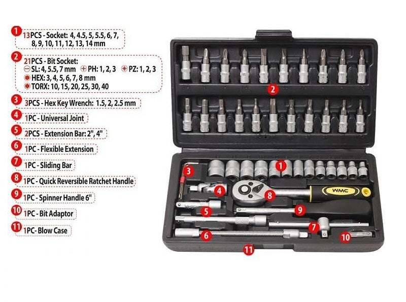Професионален комплект от 46 части - гедоре с вложки и тресчотка 1/4