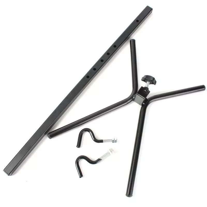 Удобна сервизна стойка за велосипед, идеална за поддръжка, почистване, настройка на скоростите и ремонт.Оборудвана с регулируеми куки по височина, които пасват на различни типове велосипеди шосейни, планински, градски и други. Пластмасовите капачки на куките предпазват рамката от надраскване, а стабилната стоманена конструкция осигурява надеждност при работа.