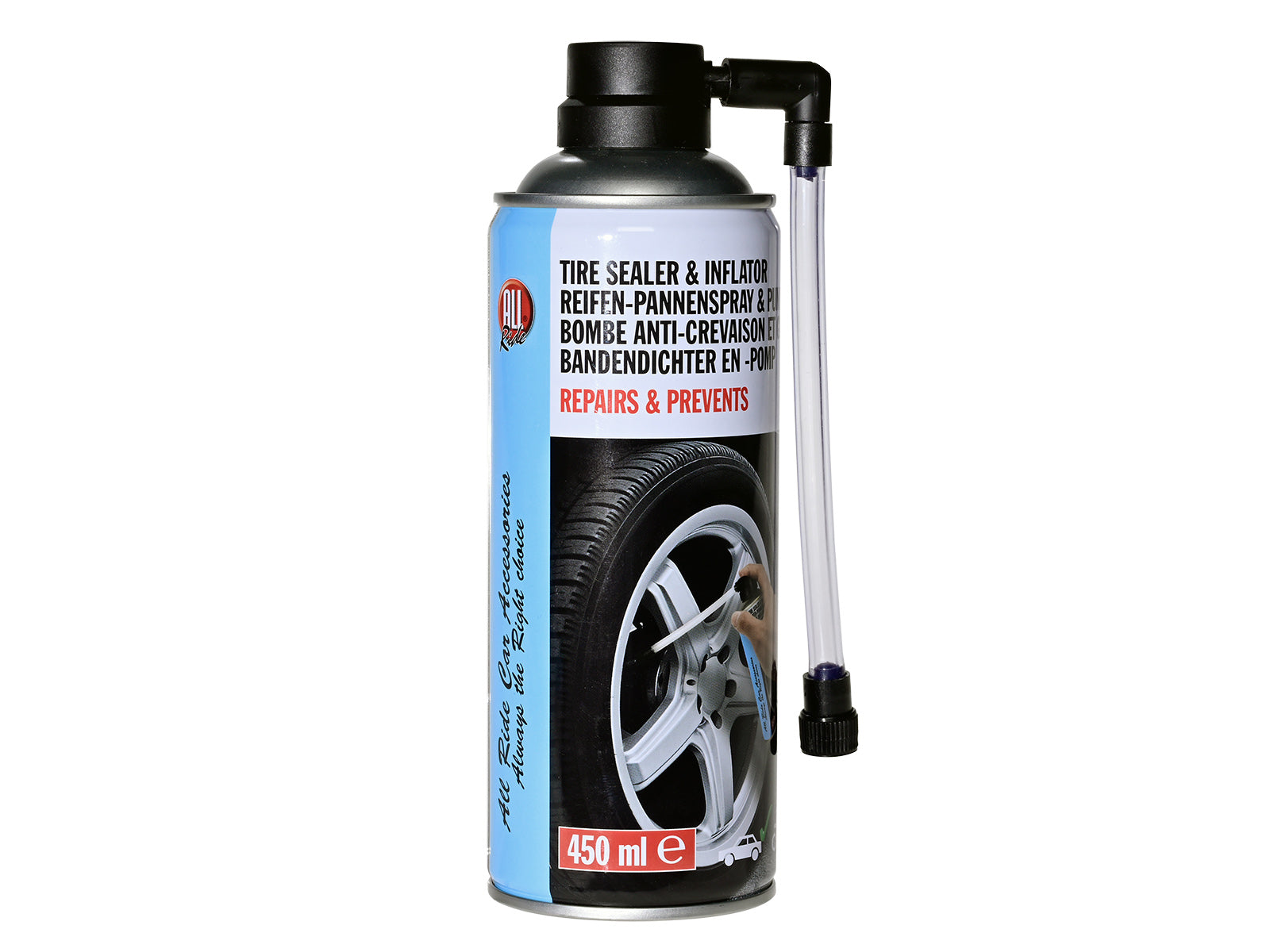 Спрей за ремонт и поправка на спукани гуми - 450 мл. Дължина на накрайника на маркуча: 16 см. Материал на кутията: алуминий. Лесен за използване продукт. Спестява време и усилия, като запушва дупката на гумата. Начин на използване: Завъртете колелото така, че мястото на спукване да е в най-ниско положение. Отстранете предмета предизвикал спукването. Изпуснете гумата напълно. Разклатете добре флакона преди употреба. Завийте накрайника към вентила на гумата. Дръжте флакона във вертикално положение с вентила надолу и впръскайте цялото съдържание в гумата. Превозното средство трябва да бъде закарано на сервиз. Шофирайте 1-2 км. със скорост до 20 км/ч. След това не превишавайте скоростта от 60 км/ч и се придвижете до най-близкия сервиз за ремонт на гумата.
