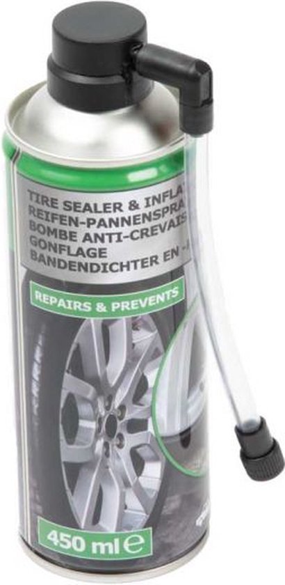 Спрей за ремонт и поправка на спукани гуми - 450 мл. Дължина на накрайника на маркуча: 16 см. Материал на кутията: алуминий. Лесен за използване продукт. Спестява време и усилия, като запушва дупката на гумата. Начин на използване: Завъртете колелото така, че мястото на спукване да е в най-ниско положение. Отстранете предмета предизвикал спукването. Изпуснете гумата напълно. Разклатете добре флакона преди употреба. Завийте накрайника към вентила на гумата. Дръжте флакона във вертикално положение с вентила надолу и впръскайте цялото съдържание в гумата. Превозното средство трябва да бъде закарано на сервиз. Шофирайте 1-2 км. със скорост до 20 км/ч. След това не превишавайте скоростта от 60 км/ч и се придвижете до най-близкия сервиз за ремонт на гумата.