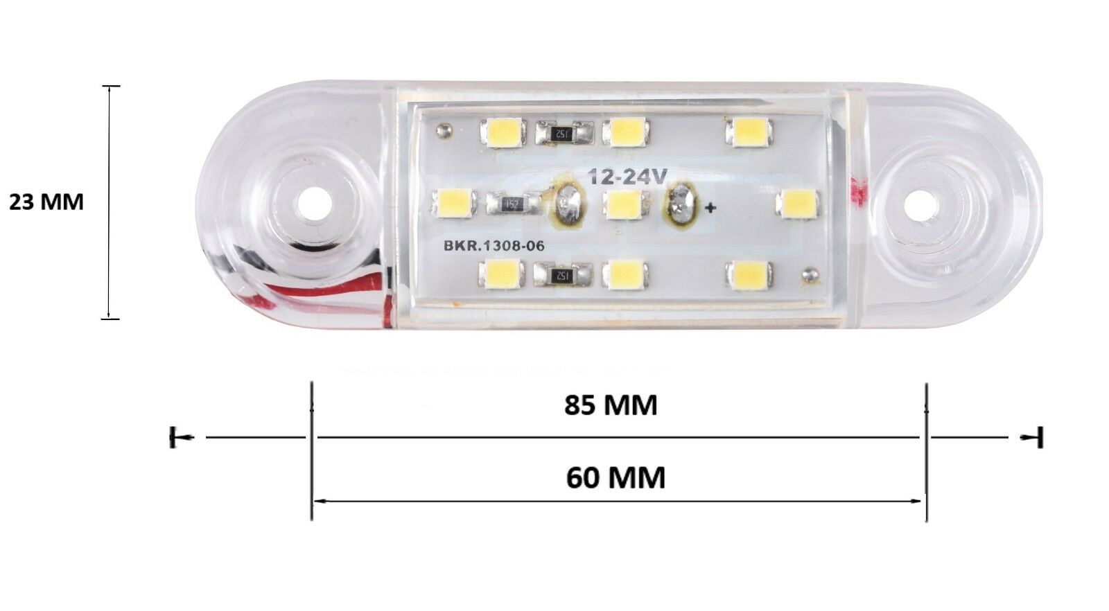 Светодиоден маркер габарит токос бяла светлина със 9 LED ЛЕД за бус ван ремарке каравана платформа Волтаж 24V ВОДОУСТОЙЧИВ НИСКА КОНСУМАЦИЯ НА ЕНЕРГИЯ ЦВЯТ: БЯЛ Светодиоди:9 ПРИЛОЖЕНИЕ: СТРАНИЧНО/ПРЕДНО Размери: 85мм х 23мм 60мм разстояние междо монтажните отвори Цената е за 1 брой!