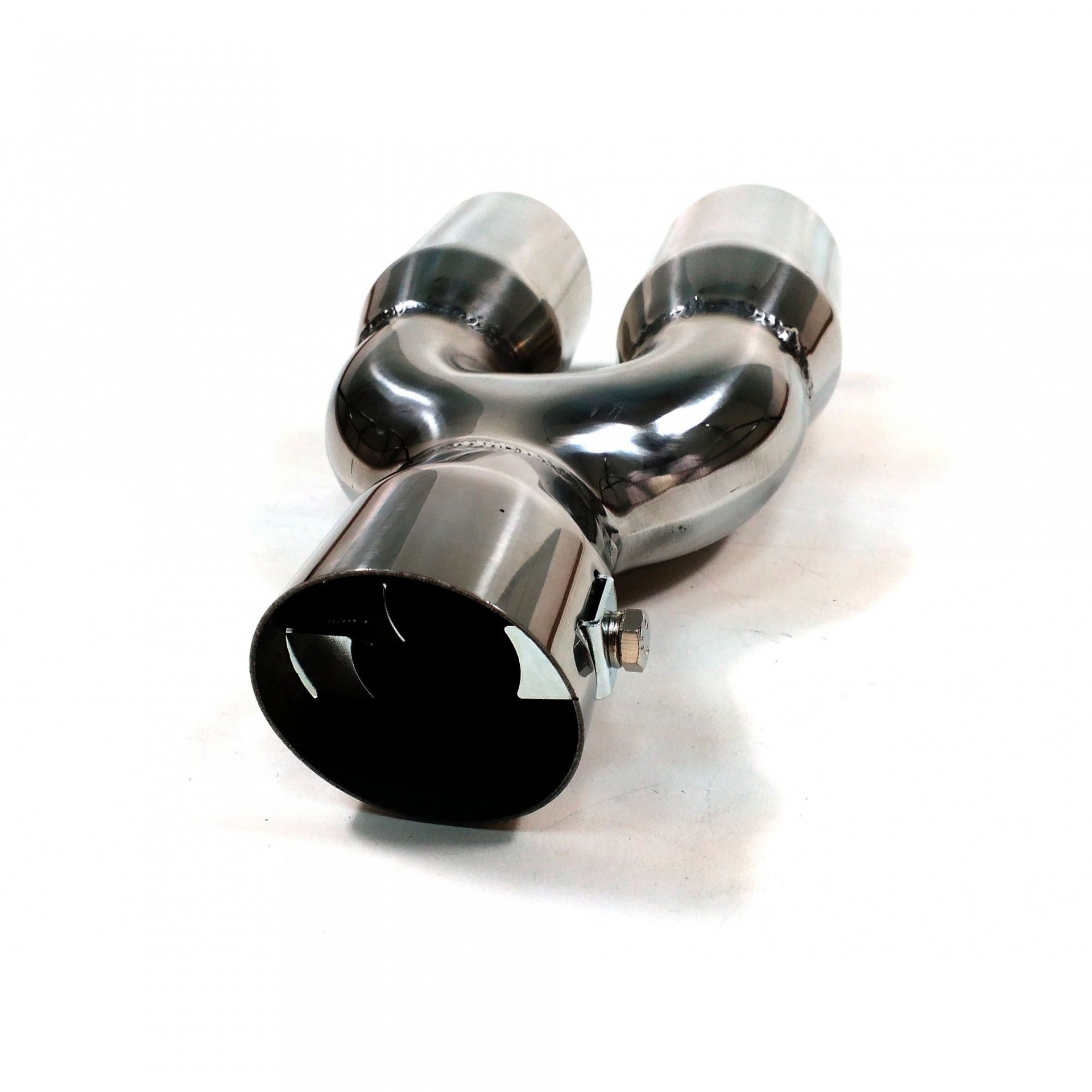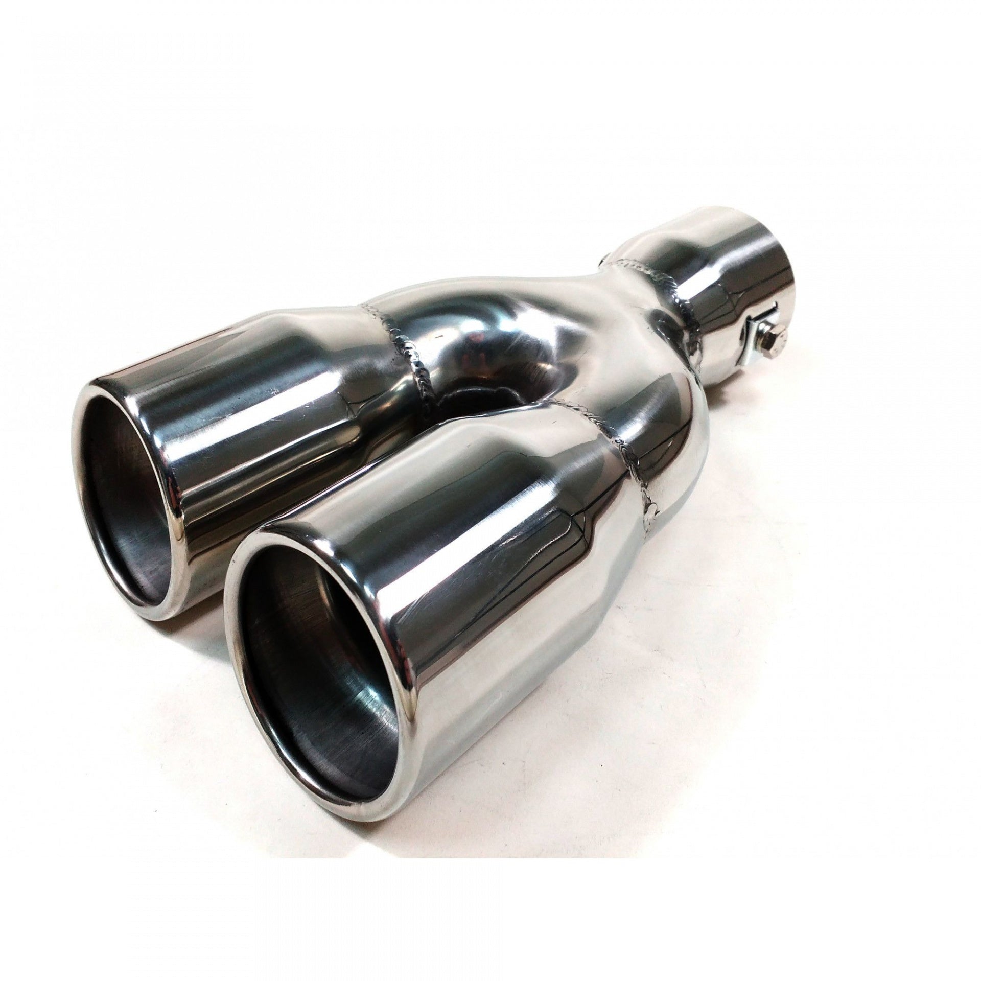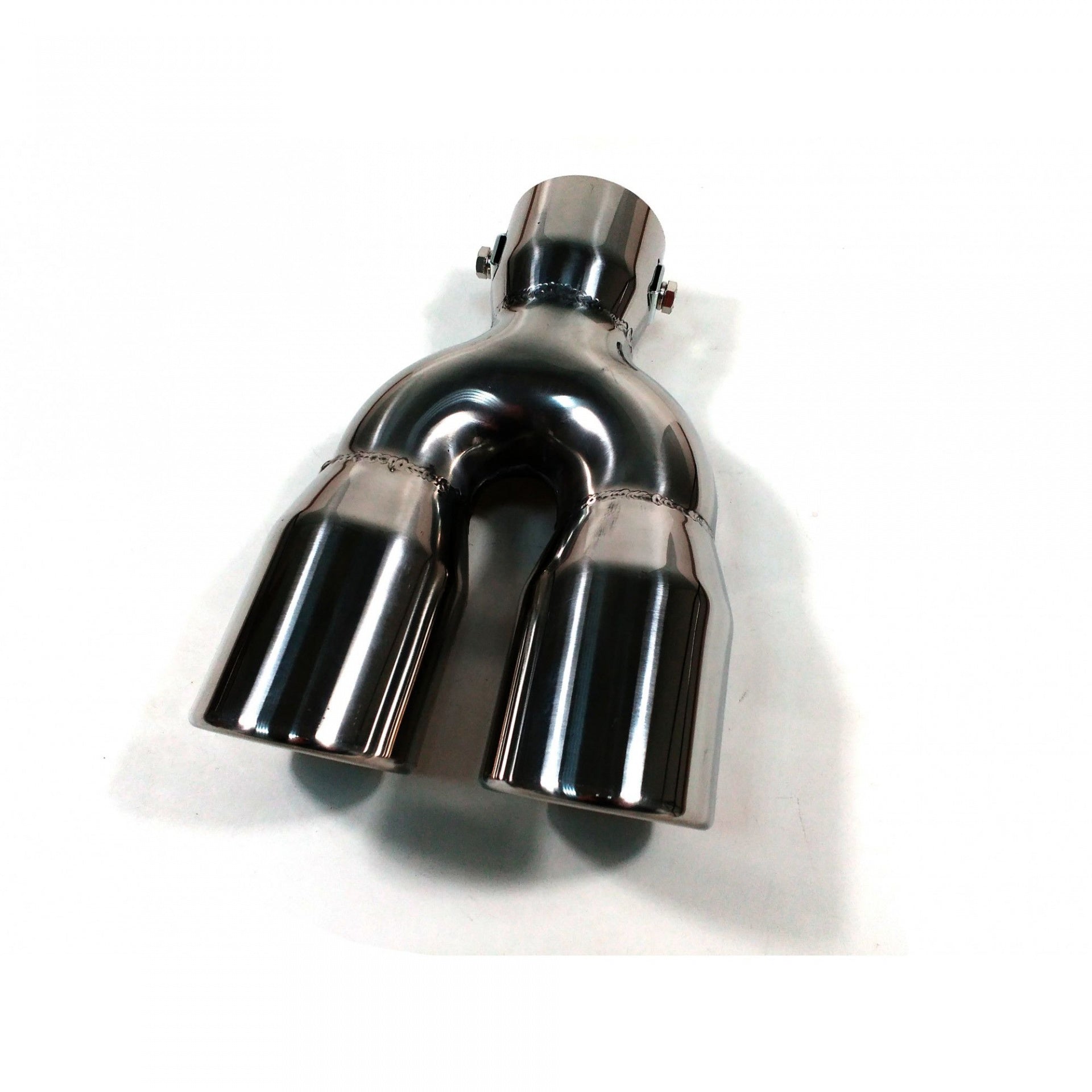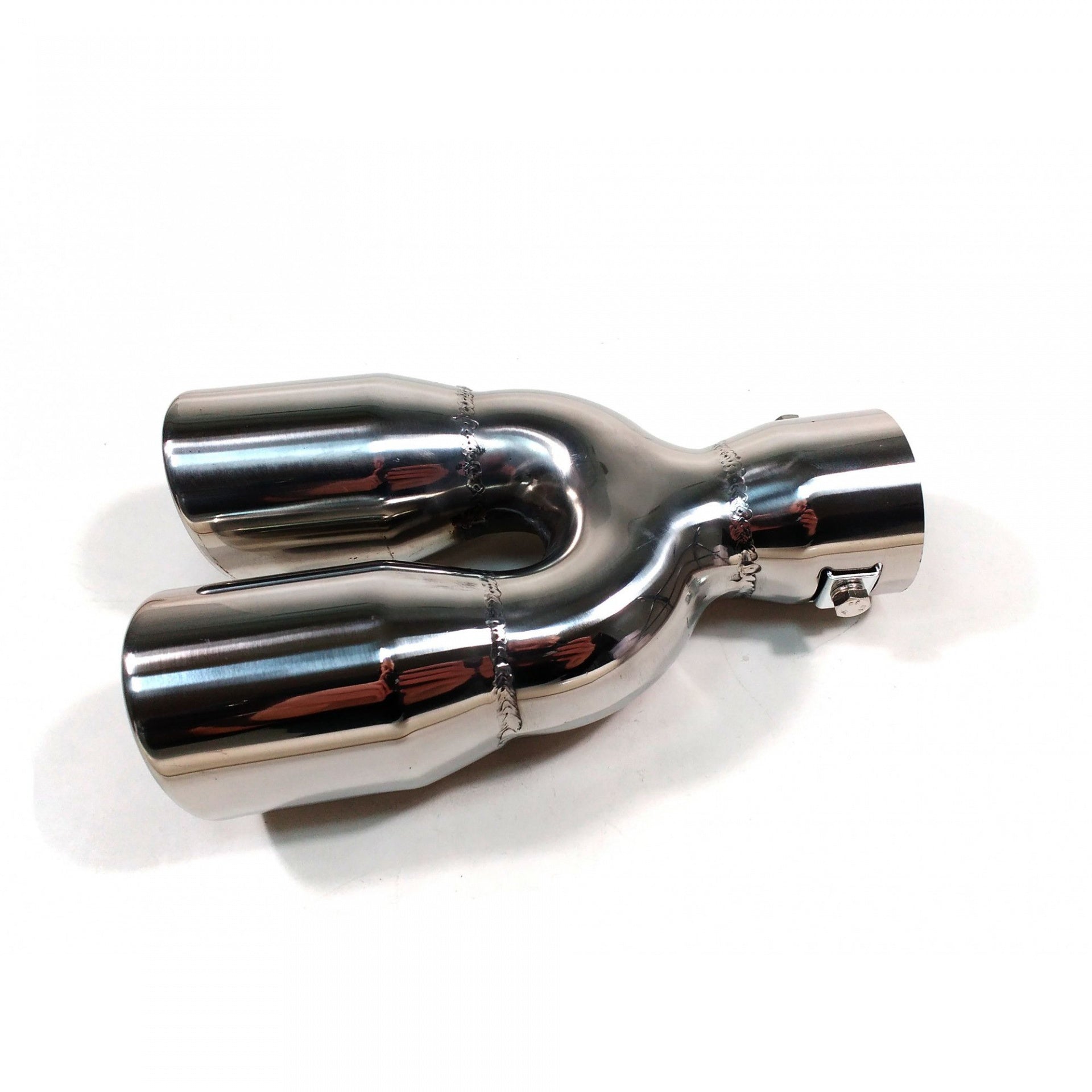Нов универсален накрайник за ауспух Изработен от висококачествени материали, хромиран Лесен за монтиране (с включени фитинги) Лесен начин да подобрите външният вид на автомобила си Размери: Вход: 5.7см Изход (двоен): 5.3см Дължина: 21см Ширина: 12.5 - 14.3см Може да се монтира на ауспух с диаметър: 3.5см - 5.5см