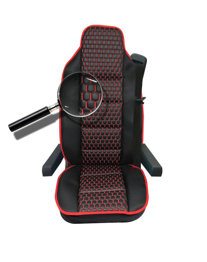 Универсален калъф за седалка на камион - релефен - еко кожа и текстил - Volvo, DAF, Man, Scania, Mercedes, Iveco - черно с червен кант и конец