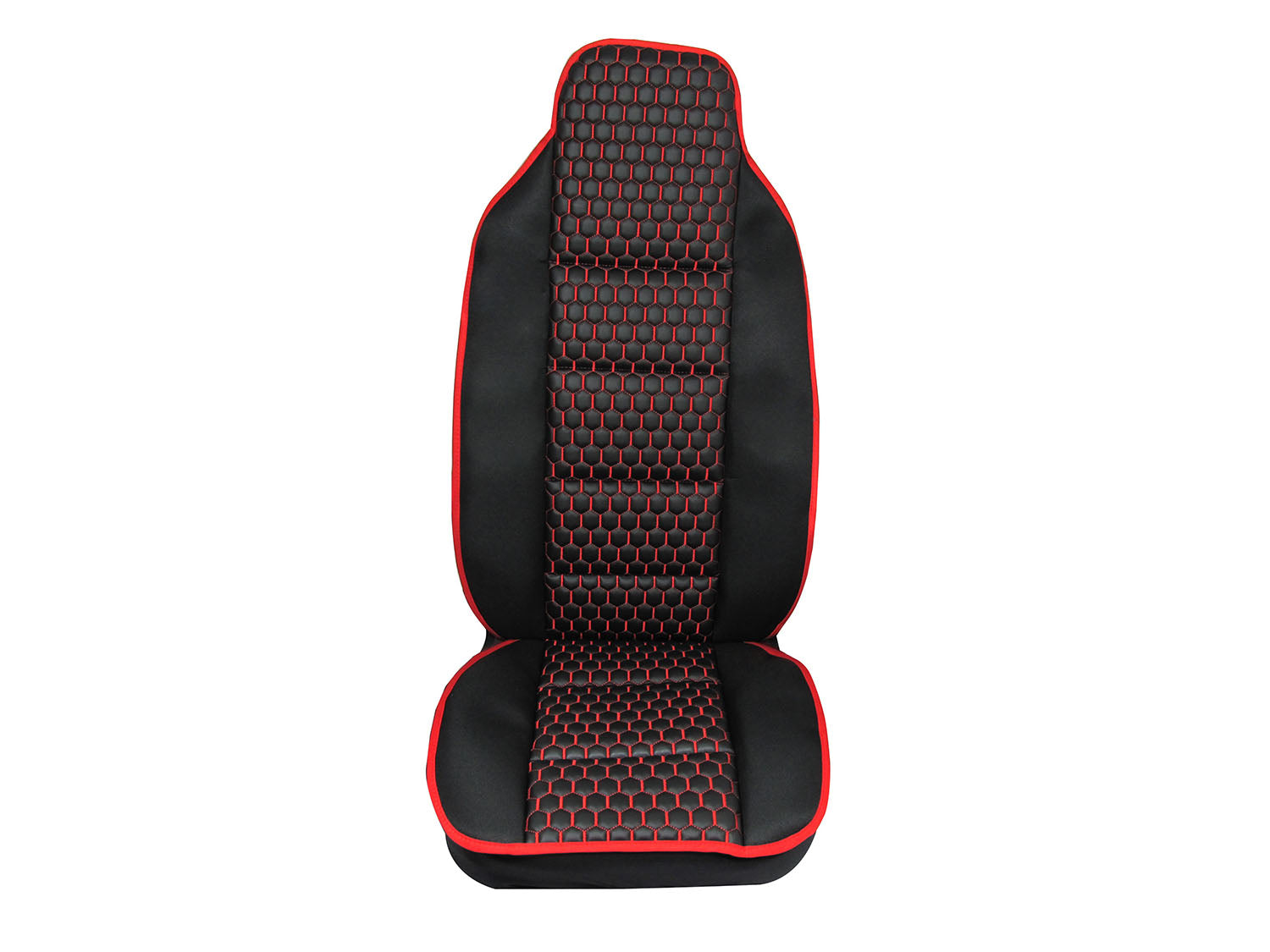 Универсален калъф за седалка на камион - релефен - еко кожа и текстил / черно - червен кант и конец / - релефен * Бързо и лесно монтиране - просто поставете върху оригиналните седалки (с ластици отдолу, така, че да се изпъва сегнато по седалката) * Подходящ за въздушни възглавници и подлакътник. * Лесно почистване - просто забършете * Ушит от еко кожа -Този калъф са предназначен да предпази вашата оригинална тапицерия от замърсяване и износване. -Дори редовно почистване не може да спре ежедневното износване. За въпроси може да ни потърсите на посочения телефон в работно време.