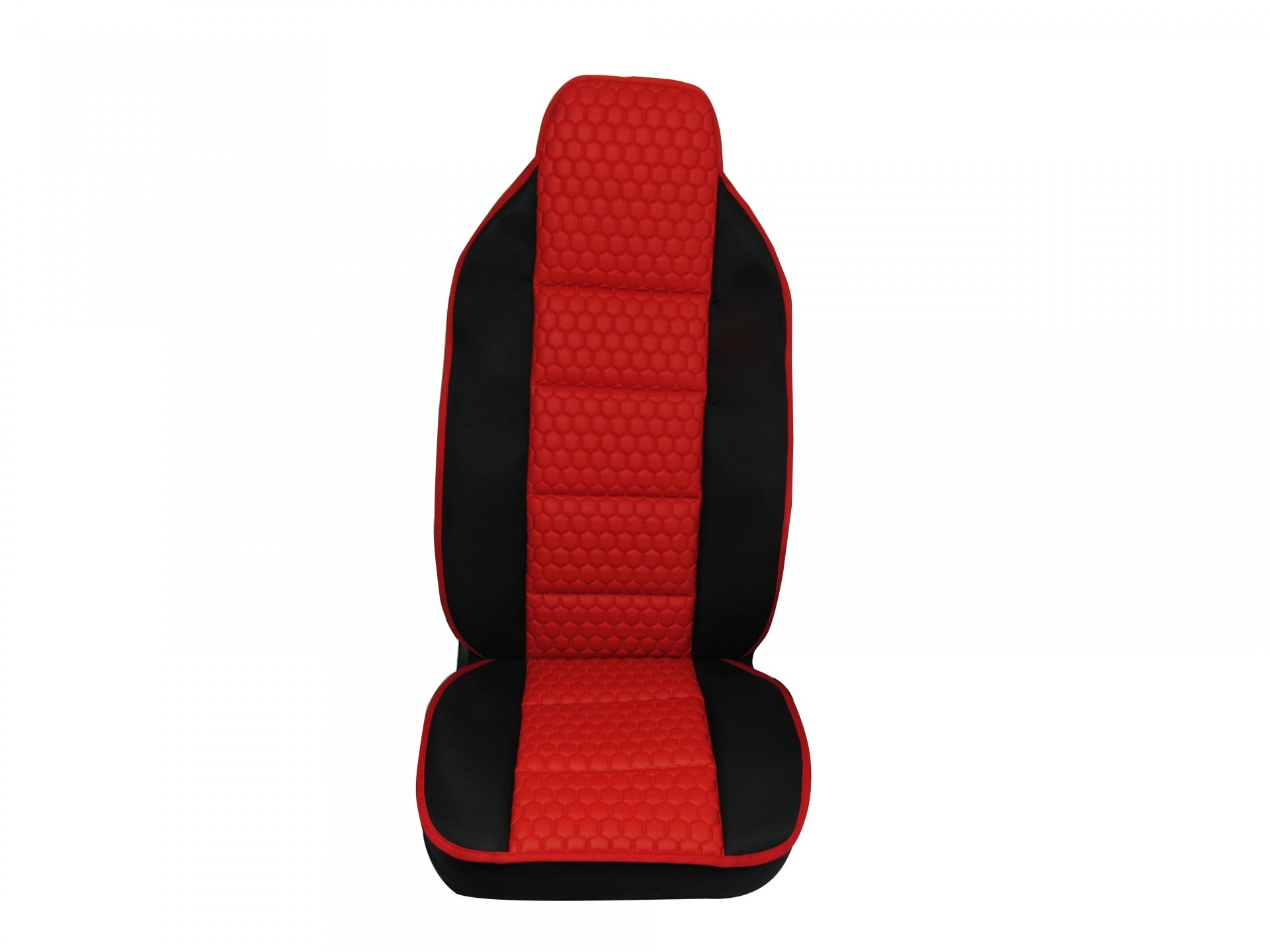 Универсален калъф за седалка на камион - релефен - еко кожа и текстил / червено с черно / - релефен * Бързо и лесно монтиране - просто поставете върху оригиналните седалки (с ластици отдолу, така, че да се изпъва сегнато по седалката) * Подходящ за въздушни възглавници и подлакътник. * Лесно почистване - просто забършете * Ушит от еко кожа -Този калъф са предназначен да предпази вашата оригинална тапицерия от замърсяване и износване. -Дори редовно почистване не може да спре ежедневното износване. За въпроси може да ни потърсите на посочения телефон в работно време.