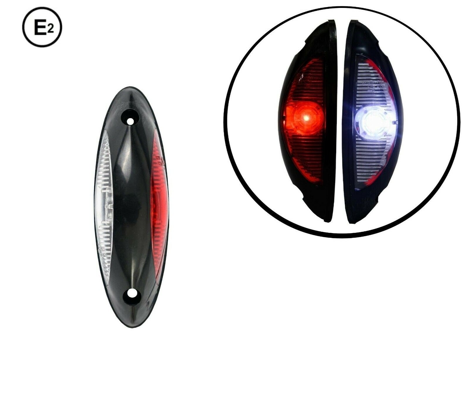Универсален LED Светодиоден Страничен Габарит Маркер червено-бяло с плоска основа за вертикален монтаж за каравана, кемпер12-24V *E-марка, CE * Цвят: Червенo Бялo *Напрежение: 12V - 24 V *Брой светодиоди: 2 *Произведено от ABS пластмаса (некорозивен корпус) *Размери: 123 мм (4,84 ) x 40 мм (1,57 ) x 37 мм (1,45 ) *Разстояние между монтажните отвори: 87 мм (3,42 )
