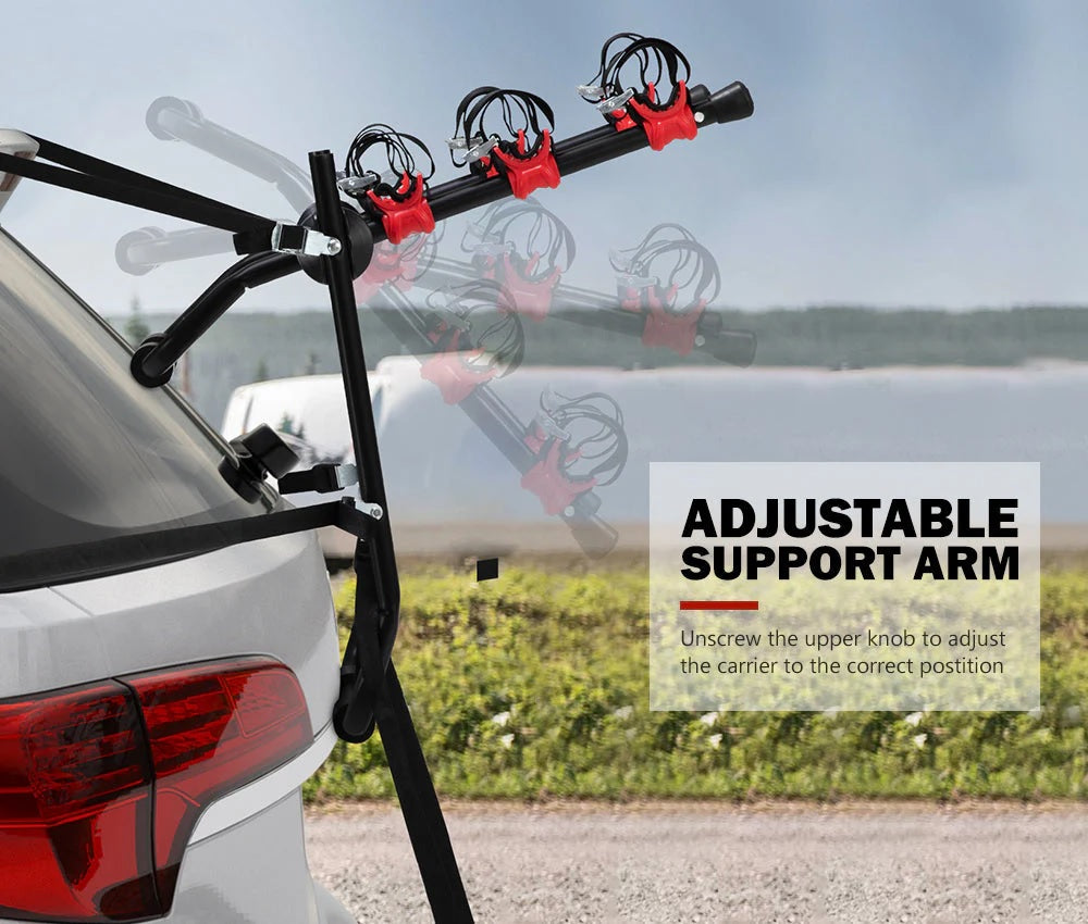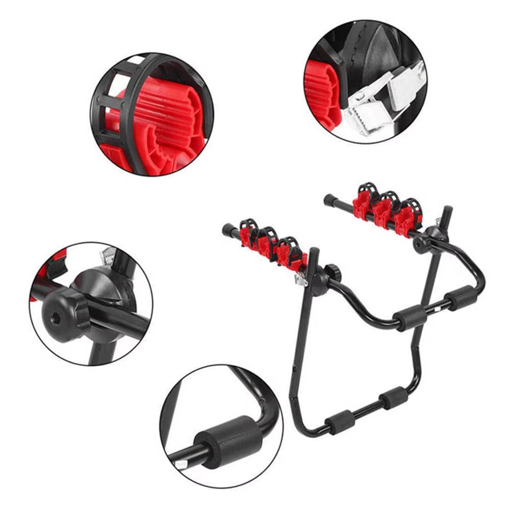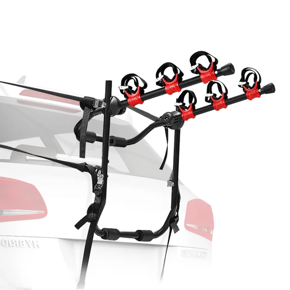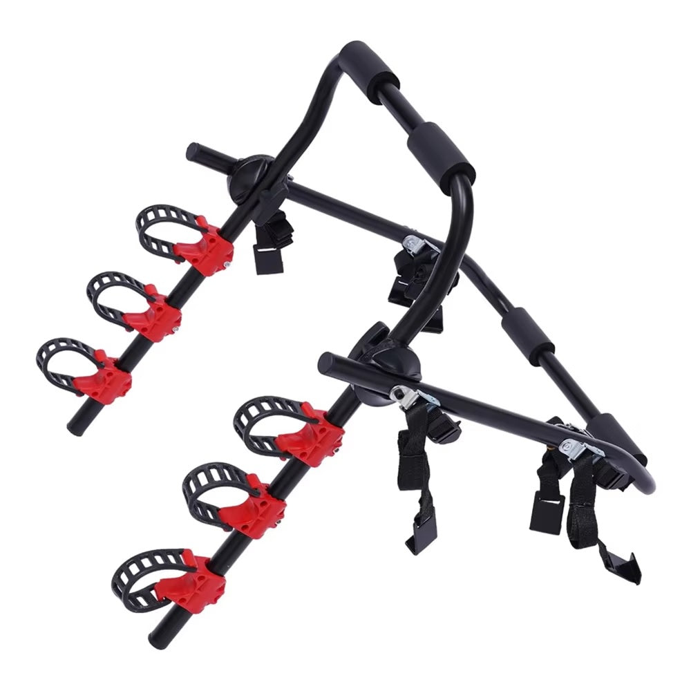 Универсален вело багажник, подходящ за монтаж на задната врата / багажника на автомобил (без джипове с външна резервна гума). Позволява безопасно транспортиране на до 3 велосипеда, без да наранява боята на рамките или автомобила.