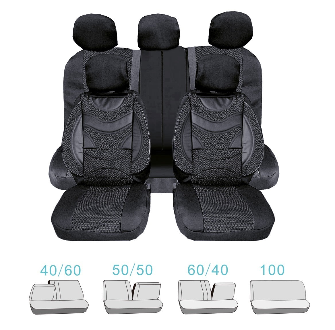 Универсална Авто Тапицерия, Пълен Комплект, Premium, Еко Кожа и Текстил, Черна, Делима Задна Седалка, 9 части Тапицерията е универсална, подхожда на всеки модел автомобил. Удобна за използване, тапицерията защитава седалките на вашия автомобил, като запазва оригиналната тапицерия от замърсяване и износване. Създава комфортна атмосфера във вашия автомобил. Изработена е от високо качествени материали - Еко Кожа и Текстил Подарете си удоволствие и стил. Тапицериите за задните седалки разполагат с 3 ципа, като съответно са подходящи за разделени седалки и покриват седалки от типа 50/50 или 60/40 или 40/60 Състои се от 9 части: 2 калъфки за предните седалки; 2 подглавника за предните седалки; Калъф за задна седалка; Калъф за облегалка; 3 подглавника за задната седалка.