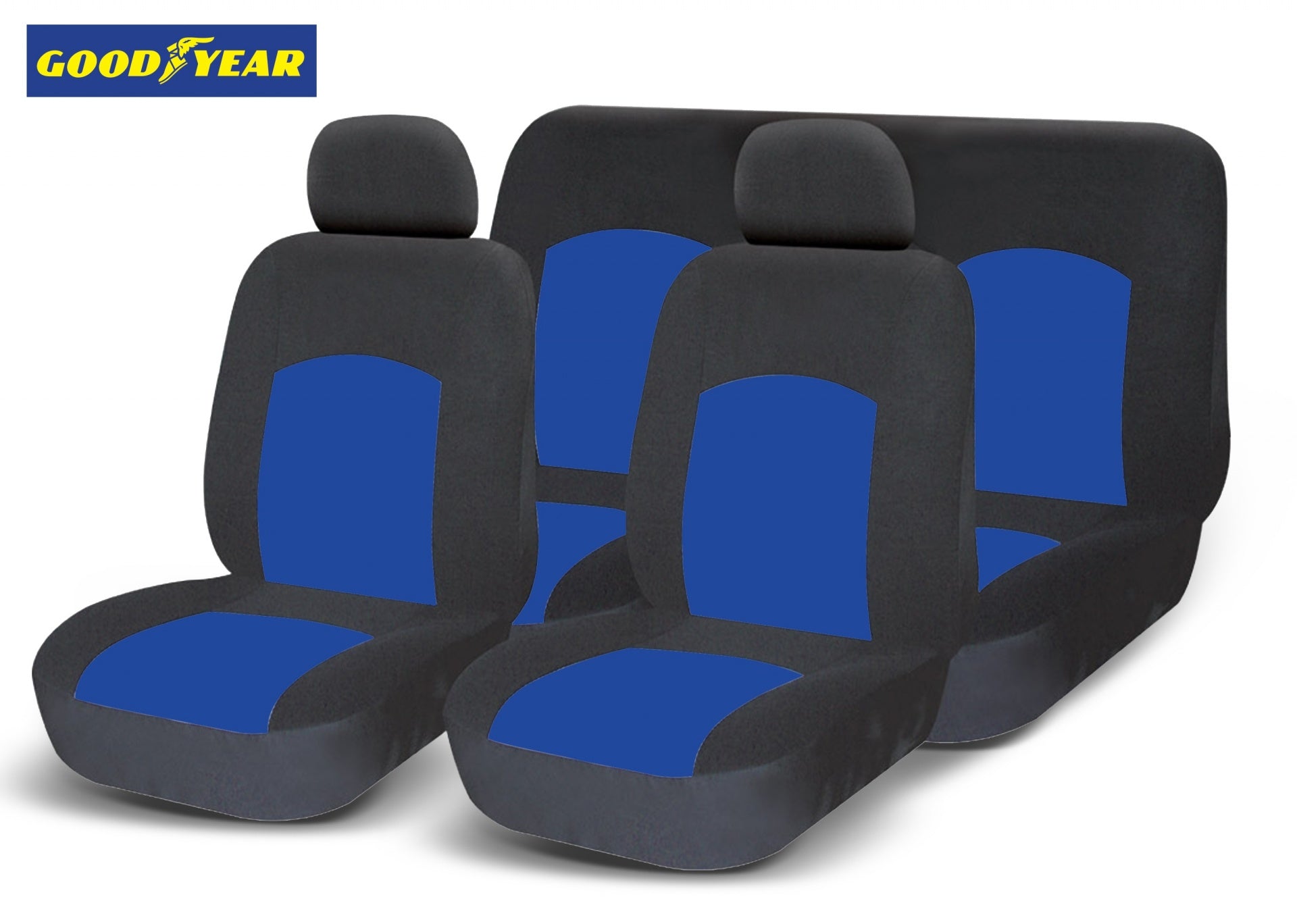 Универсална тапицерия пълен комплект калъфи за предни и задни цели седалки от текстил в синьо-черно Goodyear Гудиър