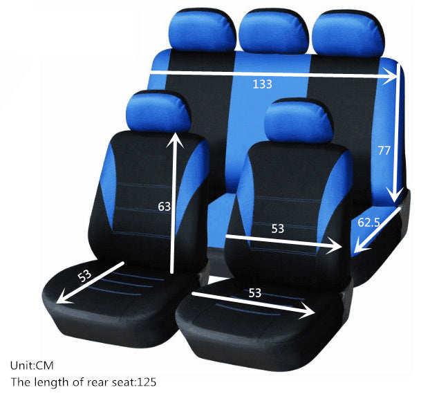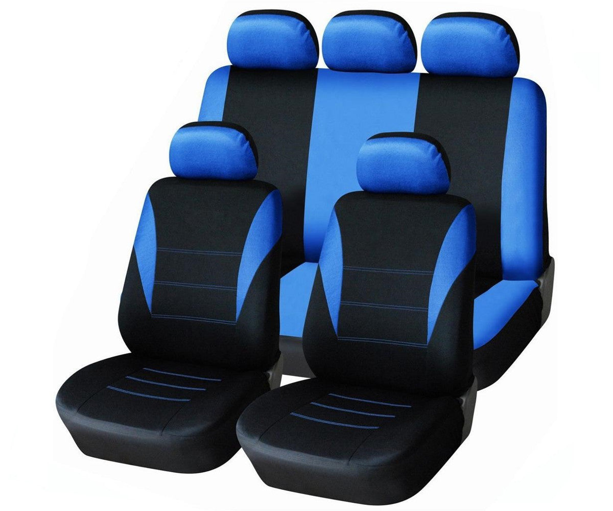 Нова текстилна тапицерия за автомобилни седалки. Цвят: Синьо - Черно Тапицерията е универсална, подхожда на всеки модел автомобил. Удобна за използване, тапицерията защитава седалките на вашия автомобил, като запазва оригиналната тапицерия от замърсяване и износване. Създава комфортна атмосфера във вашия автомобил. Изработена е от високо качествени материали. Подарете си удоволствие и стил. Състои се от: 9 части; 2 калъфки за предните седалки; 2 подглавника за предните седалки; калъф за задна седалка,; калъф за облегалка; 3 подглавника за задната седалка.