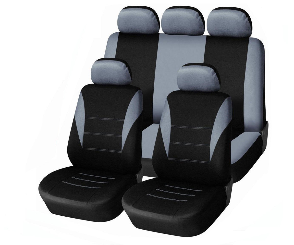 Нова текстилна тапицерия за автомобилни седалки. Цвят: Сиво - Черно Тапицерията е универсална, подхожда на всеки модел автомобил. Удобна за използване, тапицерията защитава седалките на вашия автомобил, като запазва оригиналната тапицерия от замърсяване и износване. Създава комфортна атмосфера във вашия автомобил. Изработена е от високо качествени материали. Подарете си удоволствие и стил. Състои се от: 9 части 2 калъфки за предните седалки; 2 подглавника за предните седалки; калъф за задна седалка; калъф за облегалка и 3 подглавника за задната седалка.