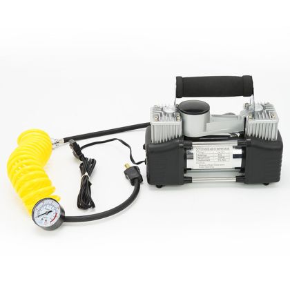 DC-12V Extra Heavy Duty въздушен компресор Kit разполага с широка гама от приложения и приставки за гумите на превозното средство, велосипедни гуми, топки, надуваеми лодки и играчки и т.н., благодарение на мощният двуцилиндров компресор.